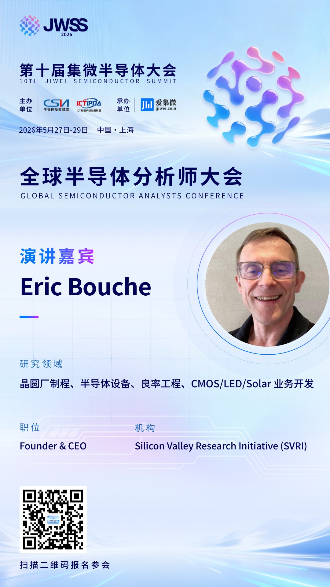 我们非常荣幸地宣布,IC 50 委员会成员、Silicon Valley Research Initiative(SVRI)创始人兼总裁Eric Bouche确认出席,并带来题为《智汇战略,韧链未来——Quantiva 赋能AI时代的供应链洞察》的专业分享。