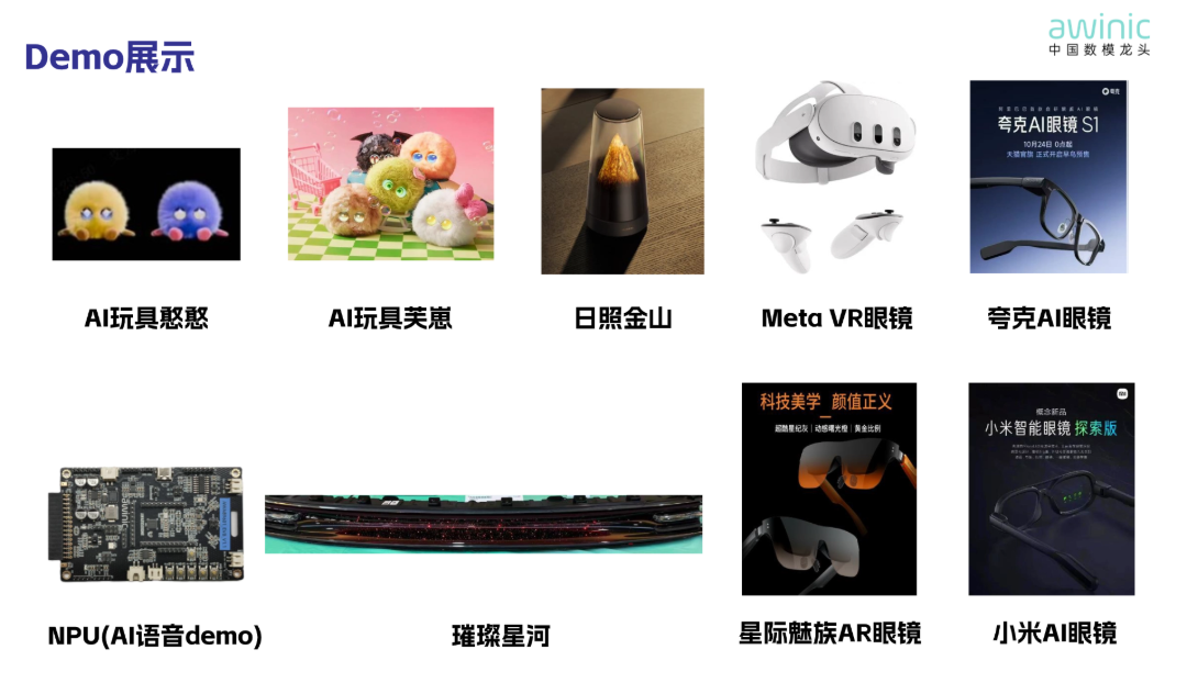 AI眼镜、AI玩具、“日照金山”、“璀璨星河”…… 艾为电子Demo 展区分布与特色产品的展示,全方位印证了艾为电子声、光、电、射、手等全技术板块的落地能力,从基础芯片方案到终端产品应用,形成了 “技术 - 产品 - 场景” 的完整闭环,直观呈现了其作为智能终端核心芯片赋能者的全栈实力与生态布局。