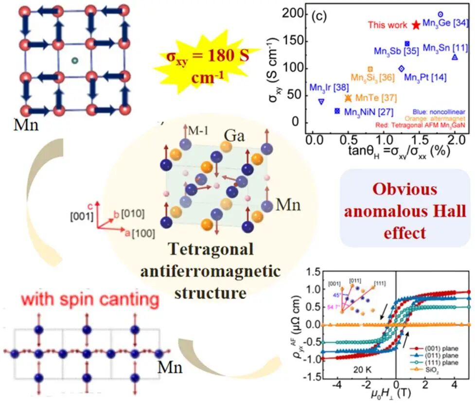 反铁磁材料在自旋电子学领域中展现出鲁棒性和超快动力学等优异的特性,使其在下一代磁存储器的应用中表现出极大的潜在应用价值。众所周知,反铁磁材料几乎不对外表现出净磁化强度,因此理论预测它不会像铁磁材料那样产生反常霍尔效应(AHE),但某些特殊的非共线反铁磁近年来却被报道可以产生显著的AHE。反钙钛矿化合物Mn3GaN存在丰富的非共线与非共面磁结构,因此成为研究反铁磁自旋输运行为的重要体系之一。Mn3GaN除了拥有被广泛关注的Γ5g三角反铁磁相外,在压力或引入空位的情况下,该体系在低温区还存在一种称为M-1的四方反铁磁结构。至今,AHE在反铁磁体系中主要存在于非共线三角反铁磁和交变磁中,该M-1四方反铁磁结构是否也存在反常霍尔效应,未曾见过报道。探索不同反铁磁结构产生AHE的可能性与机制不仅为自旋电子学的发展提供新的理论指导,而且为新型反铁磁磁存储器的研发提供新的材料基础。