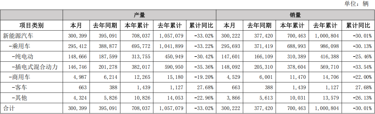 公告显示,2026年3月,比亚迪新能源汽车产量为300,399辆,去年同期为395,091辆,同比下降23.97%;本年累计产量708,037辆,去年同期为1,057,079辆,累计同比下降33.02%。销量方面,3月销量为300,222辆,去年同期为377,420辆,同比下降20.46%;本年累计销量700,463辆,去年同期为1,000,804辆,累计同比下降30.01%。