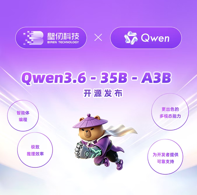 4月16日晚,阿里巴巴通义实验室正式宣布全量开源Qwen3.6-35B-A3B大模型。该模型为混合专家(MoE)模型,总参数量为350亿,激活参数仅30亿。壁仞科技(06082.HK)凭借旗舰GPU强大的通用性以及全自研BIRENSUPA™软件栈的成熟度,旗下壁砺™ 166系列产品完成Qwen3.6-35B-A3B模型的光速适配。壁仞科技致力于为国产大模型落地提供澎湃动力,在此之前已完成Qwen3.5全系列及Qwen3.6 Plus模型全量适配。