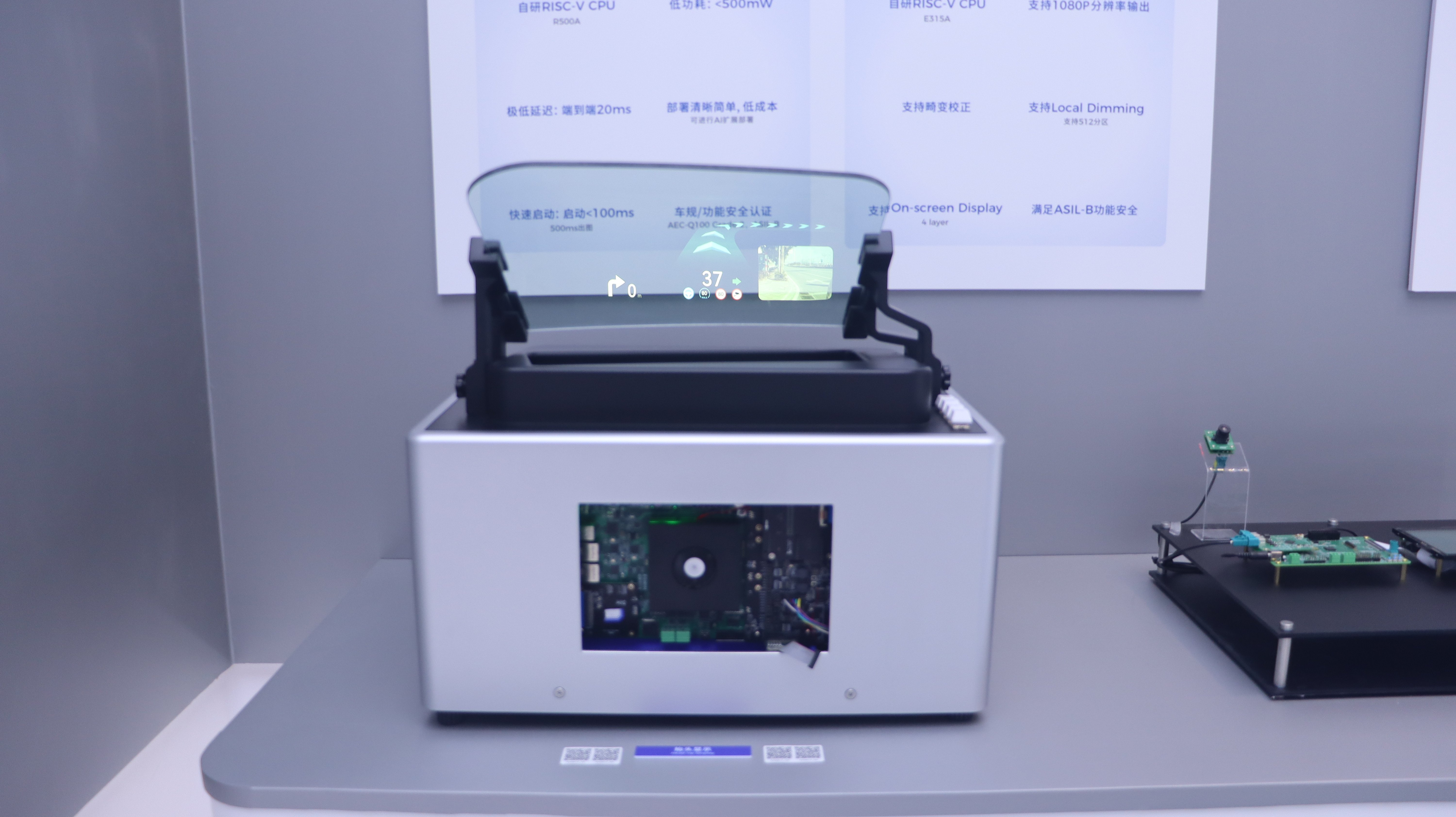 本次车展,奕斯伟计算重磅呈现了车载抬头显示专用芯片EAI8810 Demo。EAI8810是面向车载抬头显示(HUD)场景打造的专用芯片,采用奕斯伟计算自研RISC‑V内核,单芯片即可实现畸变校正、OSD(屏幕菜单式调节/叠加显示)、Local Dimming(局部背光调节)等核心功能,满足功能安全ASIL‑B认证要求,在提升系统安全性与显示效果的同时,有效提升整体方案性价比。