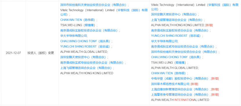 天眼查显示,12月7日,飞锃半导体(上海)有限公司发生工商变更,新增股东中电华登(成都)股权投资中心(有限合伙)、深圳草木辉信息技术有限公司、上海启维创新管理咨询合伙企业(有限合伙)、上海擎苍叁号管理咨询合伙企业(有限合伙)等。同时,注册资本由238.2091万美元增加至326.5196万美元。飞锃半导体或完成新一轮融资。
