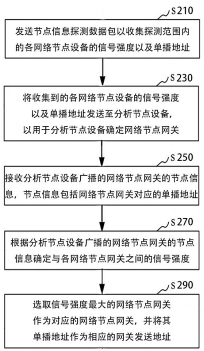 最后,根据分析节点设备广播的网络节点网关的节点信息确定与各网络节点网关之间的信号强度,并选取信号强度最大的网络节点网关作为对应的网络节点网关,将其单播地址作为相应的网关发送地址。倘若信号强度最大的网络节点网关已经连接足够数量的网络节点设备,无法再进行连接,则网络节点网关可在剩余的网关中选取信号强度最大的。