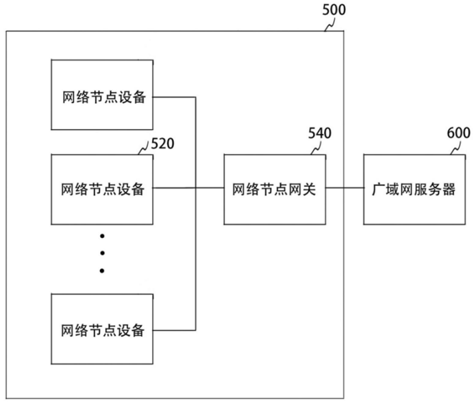 最后,如上图,为这种网状网络系统的结构示意图,这种网状网络系统500包括多个具有双模模组的网络节点设备520,通过网络节点设备,可以将网络数据通过蓝牙发送给网络节点网关540,网络节点网关再将网络数据发送至广域网服务器600。