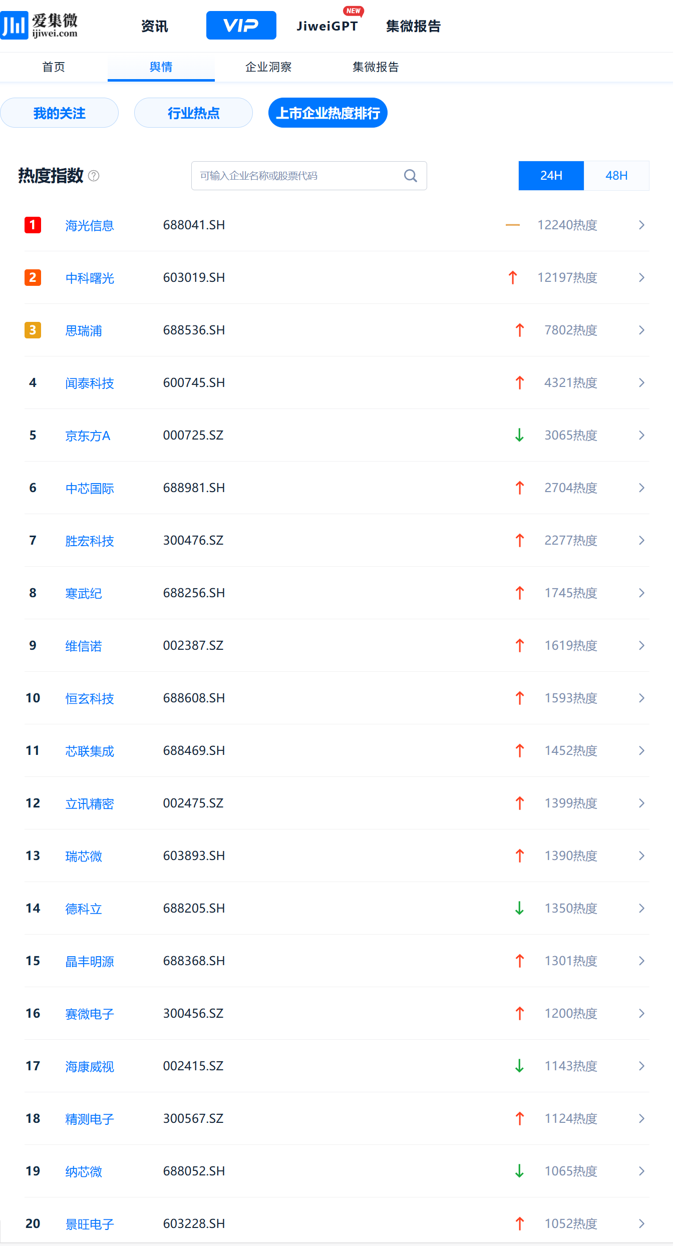 登录爱集微VIP频道,实时查看动态“上市企业热度排行”,穿透洞察每一个波动背后的驱动因素。