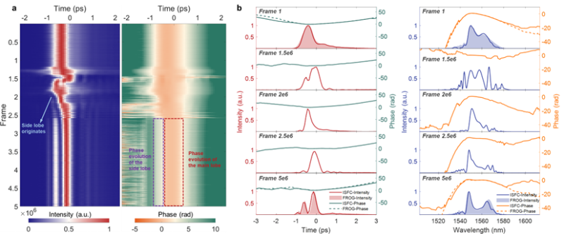 基于这一创新架构,实验系统展现出了卓越的性能指标。研究团队成功对平均能量仅为296.6pJ的飞秒脉冲进行了单帧全域表征,同时,系统实现了高达32.4MHz的测量帧率,成功捕捉并解析了可编程光谱滤波器亚毫秒级的动态切换过程。由于完全不依赖非线性效应,该技术不仅解决了低能量脉冲测量难题,更为未来探索紫外飞秒脉冲乃至阿秒脉冲的动力学特性提供了极具潜力的解决方案。