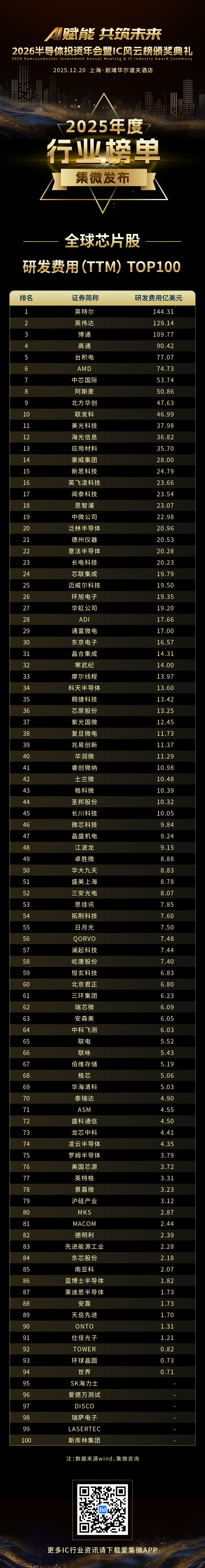 此为“全球芯片股”系列榜单之《全球芯片股——研发费用(Q3)TOP100》。