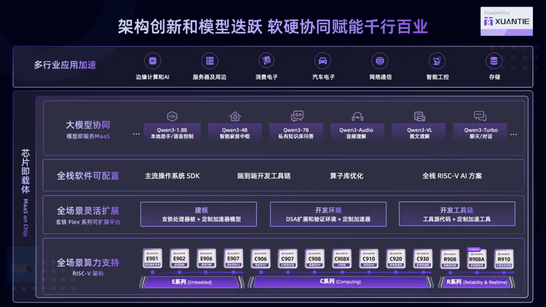 在 AI 迈向“端边云协同”的新时代,大模型的价值不仅在于云端的超强算力,更在于能否高效、低成本地部署到千行百业的终端设备中。近日,阿里通义大模型与达摩院旗下玄铁 RISC-V 宣布将基于开源架构的优势,深度融合,正式推出“Powered by XuanTie,Qwen Inside”技术战略——通义大模型算法与基于开源 RISC-V 架构的玄铁处理器将通过软硬全链路协同优化,实现通义大模型家族在 RISC-V 架构上的极致高效部署和推理性能,从端到云以崭新硬件形态,承载智能能力。未来,双方将进一步实现“模型即服务,芯片即载体”,携手生态伙伴打造下一代超级智能硬件,真正实现 AI 普惠。
