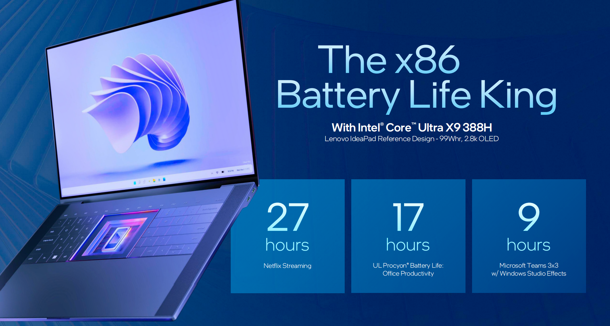 Panther Lake的能效表现提升也十分显著。从实测数据看,在同样性能下,相比前代Lunar Lake和Arrow Lake,功耗降低近40%。这种能效提升直接转化为了用户可感知的续航突破──第三代酷睿Ultra实现了长达27小时的多日电池续航。