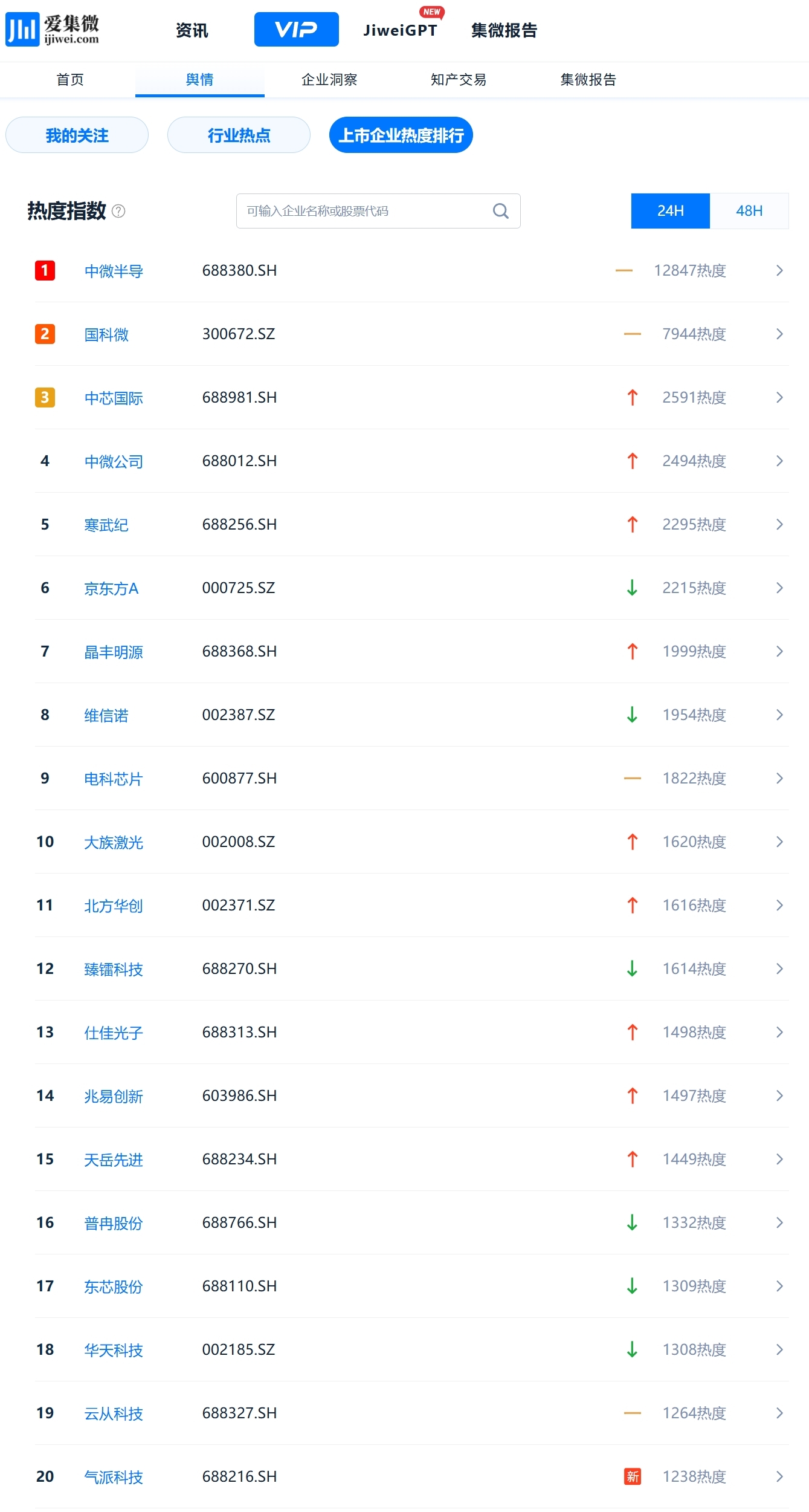 登录爱集微VIP频道,实时查看动态“上市企业热度排行”,穿透洞察每一个波动背后的驱动因素。