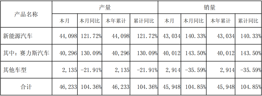 2月1日,赛力斯发布2026年1月份产销快报。数据显示,公司1月新能源汽车产量为44,098辆,同比增长121.72%;销量为43,034辆,同比增长140.33%。