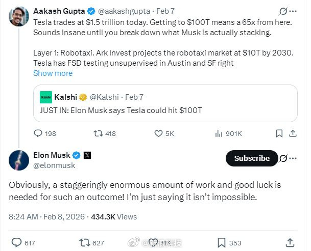 2月9日,马斯克周末表示,特斯拉市值有朝一日可能达到100万亿美元,但需要付出巨大的努力。一位网友写道:特斯拉的市值目前已达1.5万亿美元。要达到100万亿美元,就意味着要增长65倍。马斯克回应称:“显然,要实现这样的结果,需要付出极其巨大的努力并且要有十足的运气。我只是想说,这并非完全不可能。”
