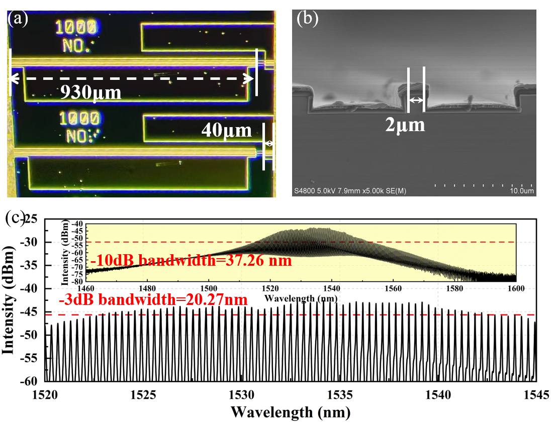 图2. (a)两段式被动锁模激光器光学显微图;(b)器件截面SEM图;(c)出射光谱图