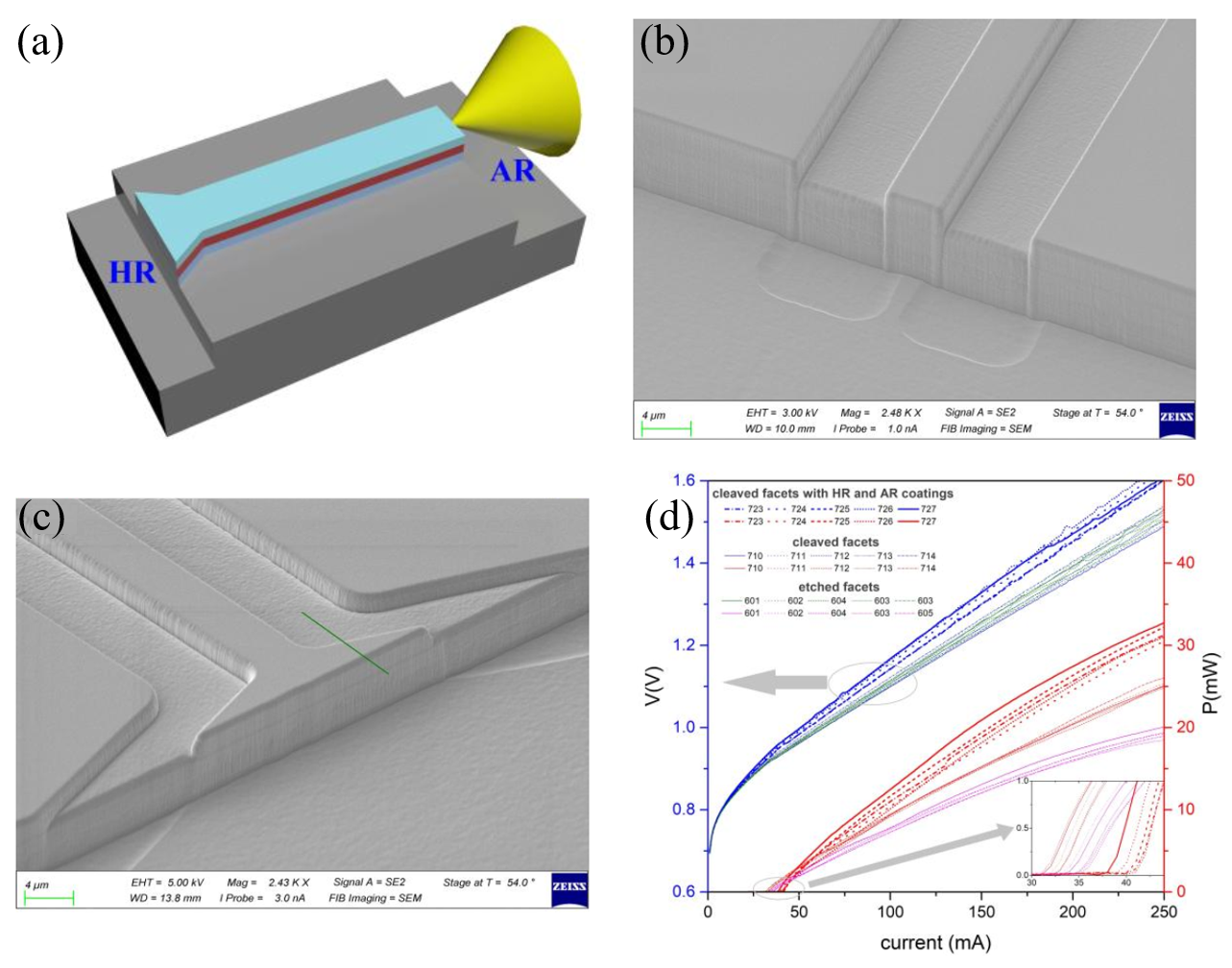 图3. (a)干法刻蚀端面激光器结构示意图;(b)AR端面SEM图;(c)HR端面SEM图;(d)刻蚀端面激光器与自然解理激光器性能对比