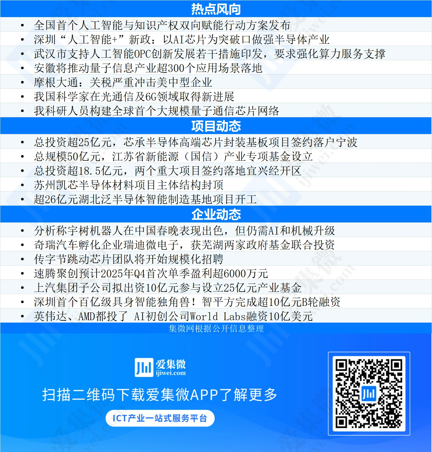 本周以来,全国首个人工智能与知识产权双向赋能行动方案发布;深圳“人工智能+”新政:以AI芯片为突破口做强半导体产业;总投资超25亿元的芯承半导体高端芯片封装基板项目签约落户宁波;苏州凯芯半导体材料项目主体结构封顶;分析称宇树机器人在中国春晚表现出色……
