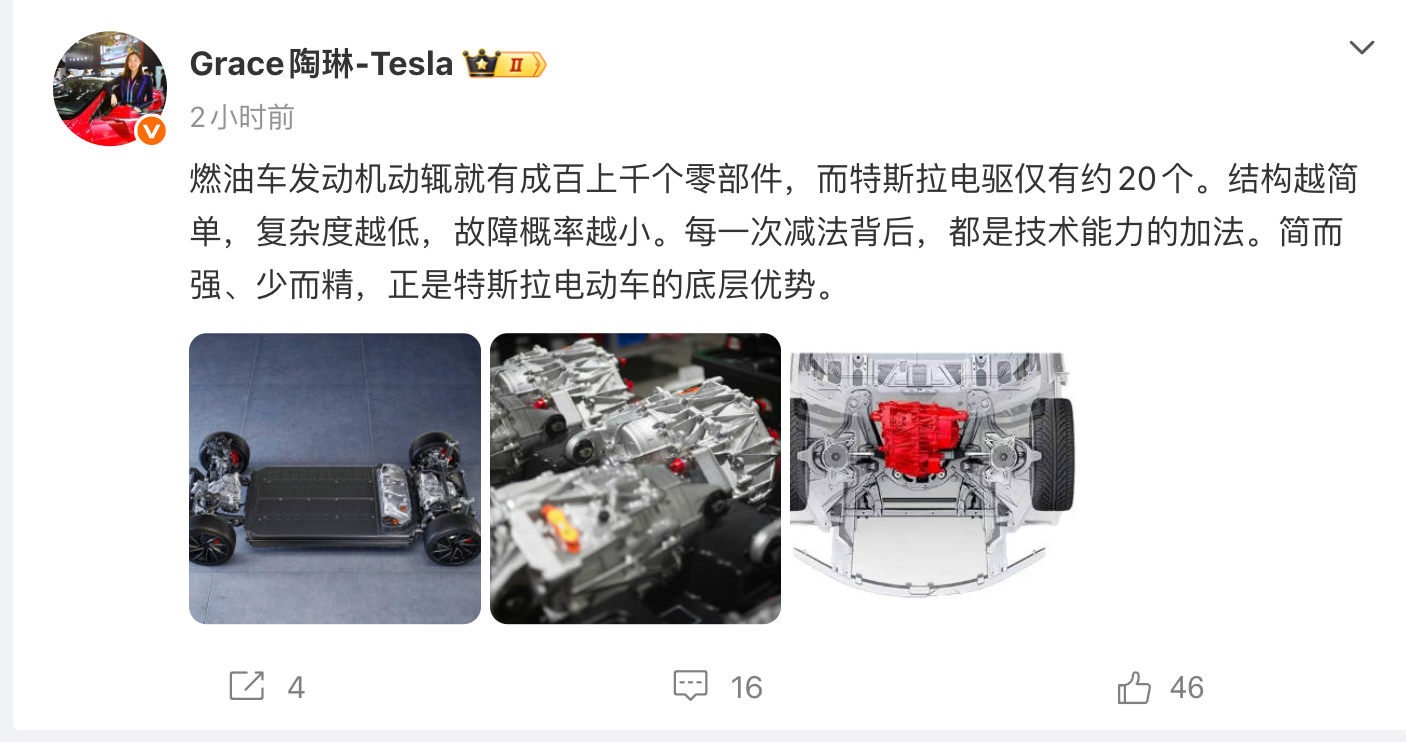 特斯拉公司副总裁陶琳发文,谈及了燃油车发动机与特斯拉电驱零部件数量的差异———燃油车发动机动辄就有成百上千个零部件,而特斯拉电驱仅有约20个。