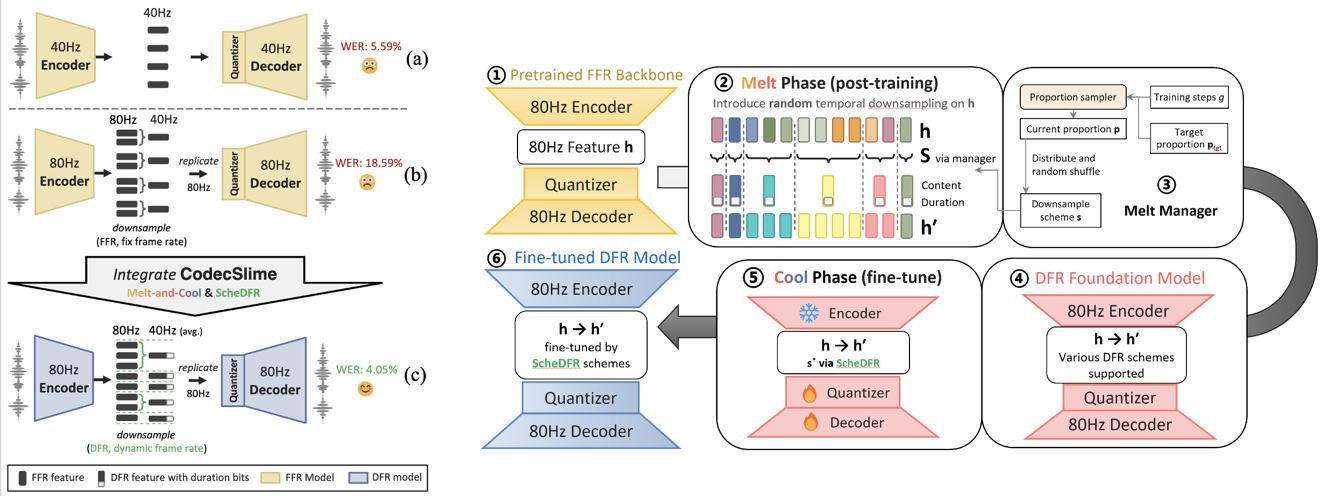 Codecslime: Temporal Redundancy Compression of Neural Speech Codec via Dynamic Frame Rate 指向神经语音编解码中的普遍问题。固定帧率机制默认语音时间信息密度均匀,然而真实语音在静音段、长元音段与快速过渡段的有效信息密度差异显著。固定帧率因此会在低信息区产生冗余编码开销。