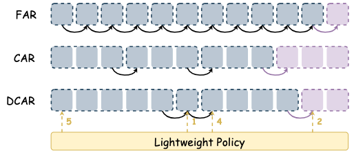 DCAR 提出 动态分块预测策略。该策略通过多词元预测训练与轻量在轨模块协同,按语音内容动态调整预测跨度,降低模型对长序列逐步递推的依赖,同时保持合成细节质量。其核心价值在于将效率优化与语音质量优化统一到同一生成机制内。