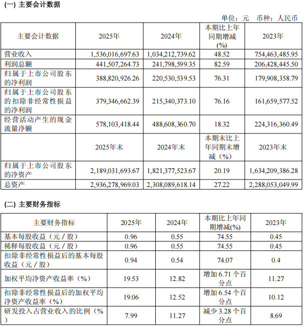 2025年,公司基本每股收益为0.96元,较上年同期增长74.55%;加权平均净资产收益率达19.53%,较上年同期增加6.71个百分点。截至2025年末,公司总资产为2,936,278,969.03元,较上年末增长27.22%;归属于上市公司股东的净资产为2,189,031,693.67元,较上年末增长20.19%。