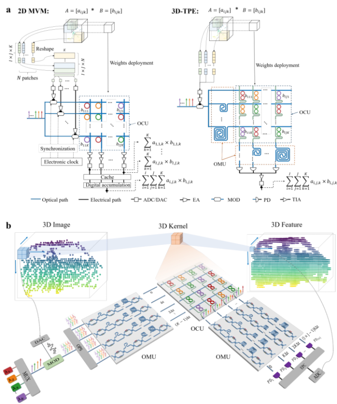 随着人工智能技术的飞速发展,深度学习任务对现有计算体系的算力吞吐量、处理延迟和能效比提出了极高要求。然而,现有电子计算架构受限于“冯·诺依曼瓶颈”与“存储墙”效应,其功耗与算力难以进一步提升。光子计算凭借其高带宽、低延迟、高并发性以及丰富的物理调控自由度等优势,被广泛视为解决未来超大规模算力需求,实现高吞吐量和高能效计算新范式的强有力的候选者之一。然而,当前大多光子硬件加速器多聚焦于2D矩阵-向量乘法计算的优化,面对神经网络中作为基本数据结构的高维张量的计算处理时,现有的2D架构面临显著挑战。首先,高阶张量需根据光子硬件规模在电域进行频繁的结构重塑与中间计算结果的缓存,引入了额外的计算开销、存储开销与时间延迟。其次,多通道数据的时序同步高度依赖外部电子时钟,缺乏在光域内直接进行数据缓存和时序对齐的能力,随着光子阵列规模的扩大,电控同步系统的复杂度急遽增加,难以发挥出光子计算在超高主频下的算力潜力与实时处理能力。
