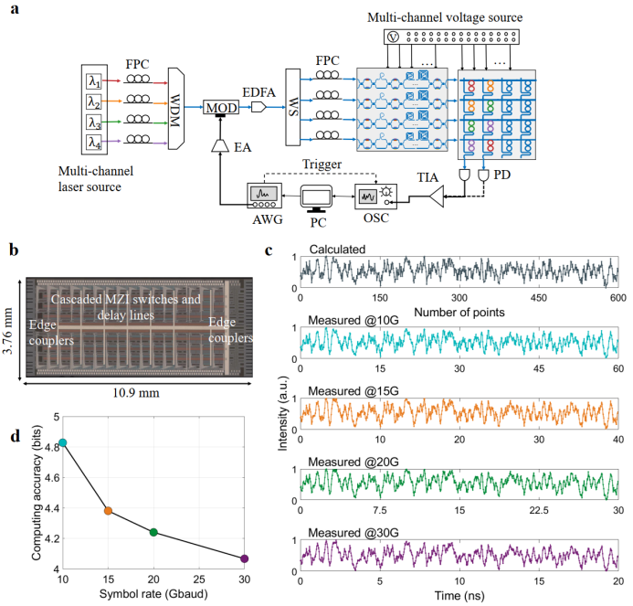 图2 基于3D双耦合微环光交叉阵列的光计算单元(OCU):(a)芯片光镜图;(b)权重单元;(c)光谱特性;(d) 权重调控;(e)权重电压映射曲线;(f-g)任意权重组合下的权重部署(f)实验与理论对比散点图以及(g)精度光缓存单元(OMU)由一个8通道可调时间延迟线阵列芯片构成,如图3所示。单个可调时间延迟线由7个级联MZI光开关及连接延迟波导组成,延迟分辨率为4.93 ps(对应约200 GHz的自适应时钟频率),最大延迟时间达310.59 ps,延迟误差被严格控制在0.6 ps以内。通过调配不同光学路径的时间延迟量,团队进行了10 Gbaud到30 Gbaud码率下的系统计算能力评估,系统测试表明,在固定权重组合下的4通道并发计算精度为4.1至4.8 bits之间。