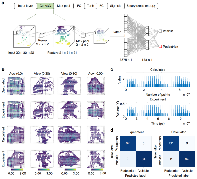 图3 用于时钟频率调控的光缓存单元(OMU): (a) 实验装置图;(b)光缓存单元芯片光镜图;(c-d)10G至30G码率下的理论计算与实验(c)波形对比与(d)等效计算精度在概念验证实验中,团队使用该3D-TPE光子计算引擎执行了3D CNN中卷积层的卷积计算,如图4所示。在20 GHz的系统时钟频率下,执行了激光雷达3D点云图像识别推理任务,达到97.06% 的识别准确率,其结果与数字计算结果相当。