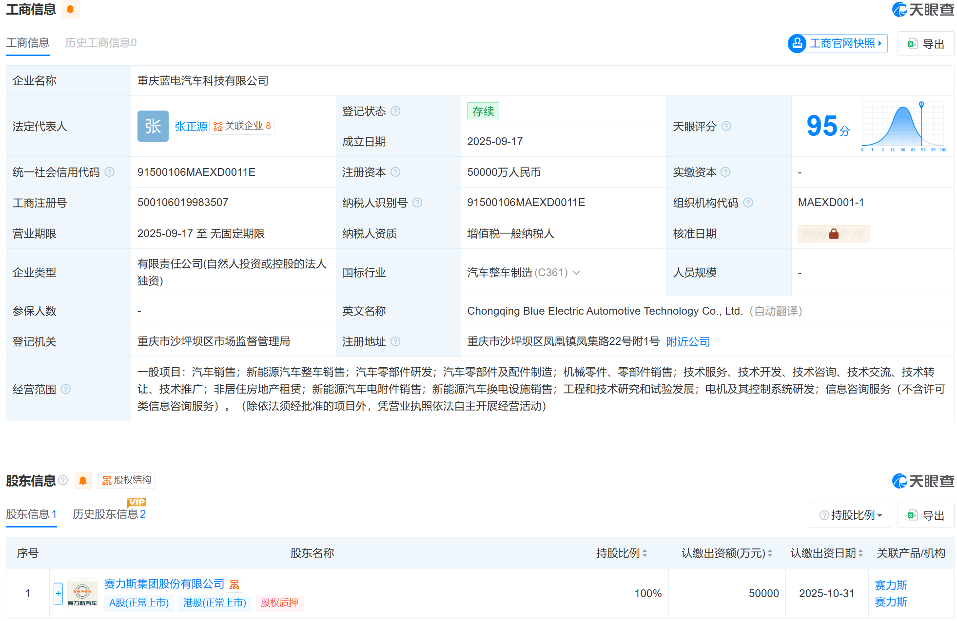 天眼查显示,近日,重庆蓝电汽车科技有限公司完成股东变更,重庆青凤科技发展有限公司、重庆园投仓储服务有限公司退出股东行列,赛力斯集团股份有限公司持股比例由35%提升至100%,实现对该公司的全资控股。