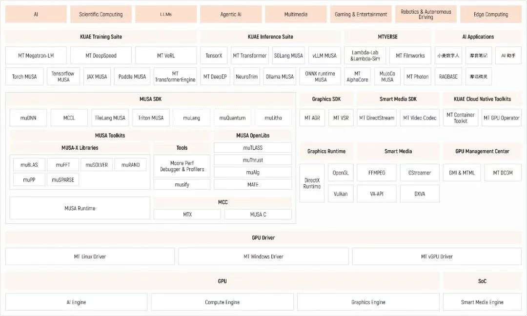 核心技术层面,摩尔线程采用自主研发的MUSA架构,在业内率先实现了单芯片同时支持AI计算加速、图形渲染、物理仿真和科学计算、超高清视频编解码的技术突破,并成为国内极少数原生支持从FP8到FP64全计算精度的GPU厂商。